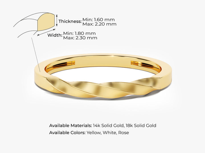 ✥ The 14K solid gold twist wedding band for women offers a delicate and unique design, featuring an elegant twist pattern that symbolizes intertwined love and unity. Crafted from solid gold, the band is available in a width range of 1.80mm to 2.30mm, providing a sleek and refined appearance. Available in 10K, 14K, or 18K purity, this timeless piece can be customized in yellow gold, white gold, or rose gold, making it a perfect choice for those seeking a meaningful and stylish wedding band or anniversary gift.