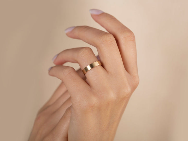 ✥ The 4.0mm classic flat wedding band with a matte brushed finish is a perfect anniversary gift, offering a modern yet timeless style. Crafted from solid gold, this band is available in 10K, 14K, or 18K purity, ensuring both durability and a luxurious feel. The 4.0mm width provides a comfortable fit, while the matte brushed finish adds a contemporary, understated elegance to the classic flat design. Available in yellow gold, white gold, or rose gold, this wedding band is a beautiful symbol of love and commitment, making it an ideal choice for commemorating your special anniversary.