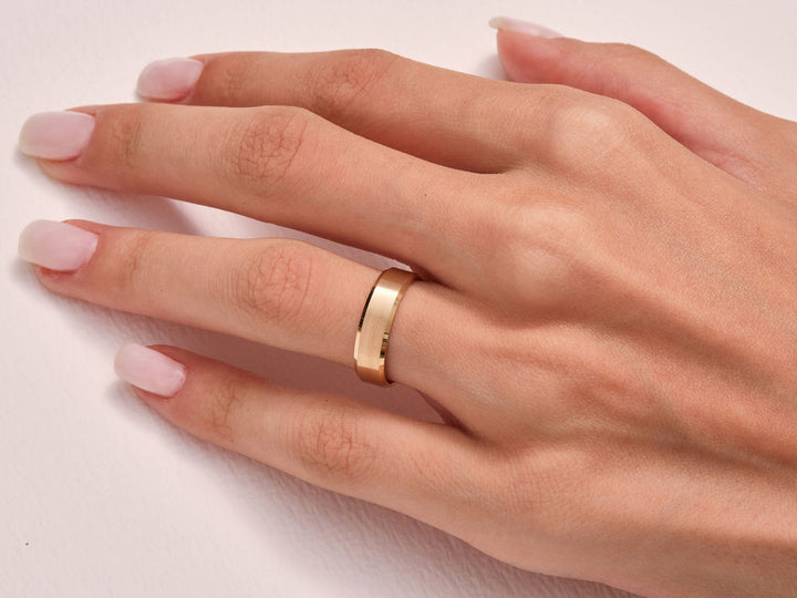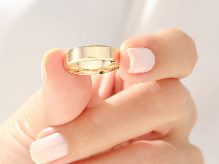 ✥ The 5.0mm beveled edge matte brushed wedding band is a perfect blend of modern sophistication and timeless design. Made from solid gold, this band is available in 10K, 14K, or 18K purity, offering both durability and elegance. The 5.0mm width provides a substantial, comfortable fit, while the matte brushed finish adds a refined, understated texture. The beveled edges bring a sleek and contemporary touch to the design. Available in yellow gold, white gold, or rose gold, this wedding band is a beautiful symbol of love and commitment.
