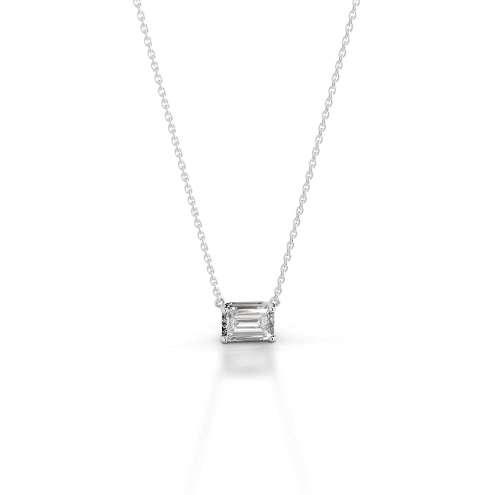 Our stunning Emerald Diamond Solitaire Pendant, a masterpiece of sophistication and uniqueness. Crafted with exquisite attention to detail, this pendant features a breathtaking oval diamond set in a distinctive east-west style, setting it apart as a true one-of-a-kind piece.