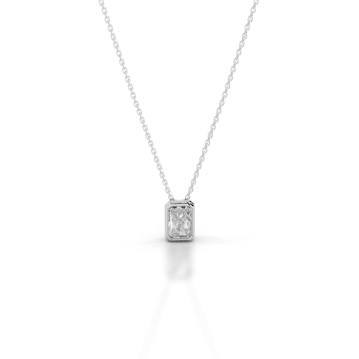 Indulge in timeless elegance with our exquisite Radiant-shaped diamond solitaire pendant, Meticulously crafted and set with a distinctive bezel setting, this pendant elevates the allure of the classic solitaire with a touch of modern allure. The pear-shaped diamond, renowned for its captivating brilliance and delicate silhouette, is meticulously selected to ensure unparalleled quality and brilliance.