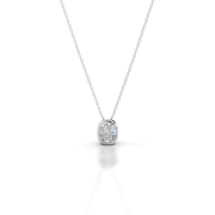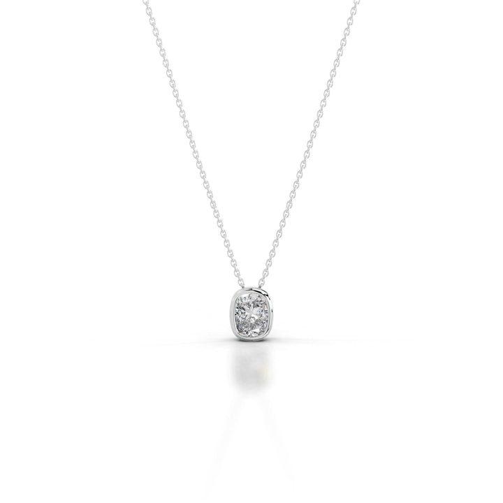Indulge in timeless elegance with our exquisite Cushion-shaped diamond solitaire pendant, Meticulously crafted and set with a distinctive bezel setting, this pendant elevates the allure of the classic solitaire with a touch of modern allure. The pear-shaped diamond, renowned for its captivating brilliance and delicate silhouette, is meticulously selected to ensure unparalleled quality and brilliance.
