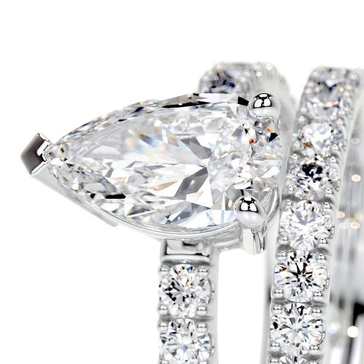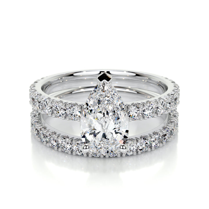You two are the perfect pair. Here's an ideal pear to show the world. Our 2.5-ctw E VS1 pear beauty is flanked by superbly sized accent diamonds gracing the shank. What a gorgeous way to show your love. The center stone is a 1.5 Carat & additional of.50 Carat Diamonds on the sides. Including .50 Carat Matching Wedding Band.