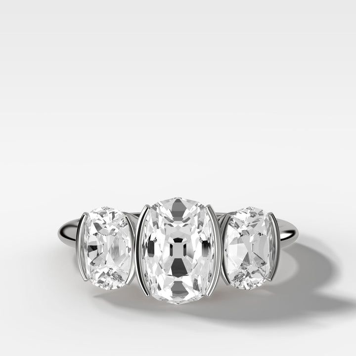 Half Bezel Triad Engagement Ring With Elongated Old Mine Cut Diamonds