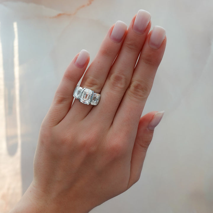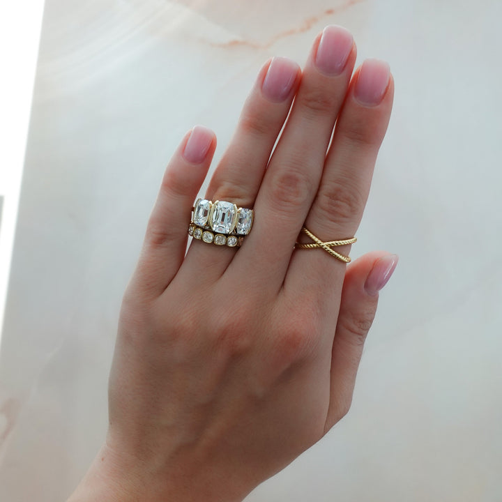 A hybrid between our infamous Triad & Half Bezel designs, with two delicate bezel lips protect each gemstone's edges.... and that's it. We've left the sides completely exposed so that you may appreciate your diamond from all angles