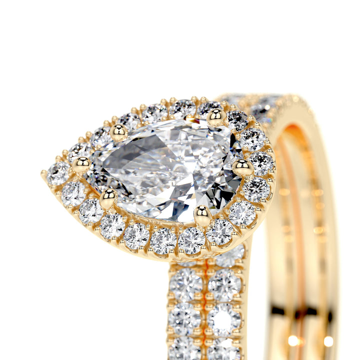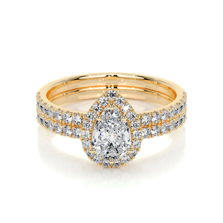 A Stunning Pear Diamond - 1.65 Carat Total Weight; Center Diamond is a 1 Carat E Color VS1 Clarity set on Elegant Halo Ring along with 0.35 Carat Round Diamonds on the sides; Including a matching wedding band with 0.30 Carat Diamonds.