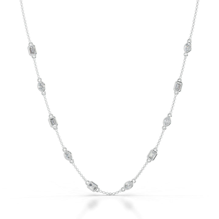 Introducing our latest masterpiece, our Multi-Shape Diamonds Chain Collier. Meticulously crafted, this exquisite piece showcases a harmonious blend of marquise and emerald diamond shapes, Each diamond, carefully selected for its exceptional quality, radiates timeless beauty and prestige.