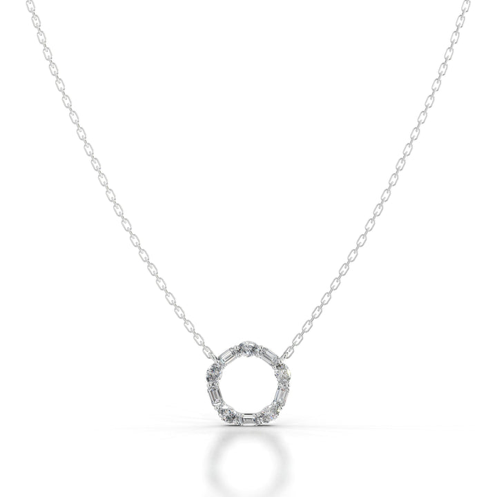 Our circle diamonds pendant, this piece from our diamond jewelry collection boasts a mesmerizing array of emerald and oval-shaped diamonds, each meticulously selected to exude brilliance and allure.Delicately suspended from a lustrous hoop, the diamonds dance with every movement, casting a spell of shimmering light and unparalleled charm.