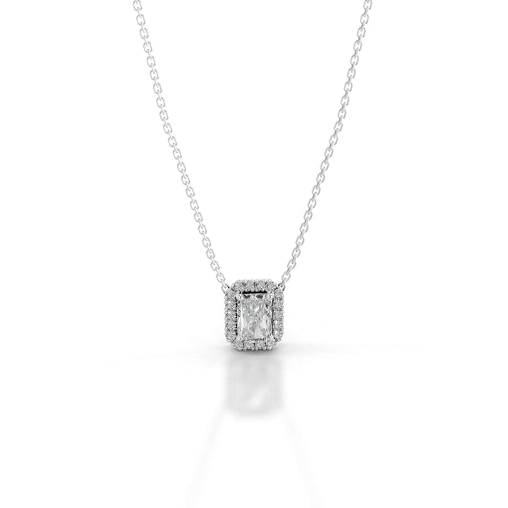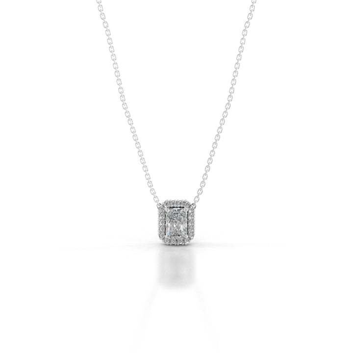 Elevate your elegance with our exquisite Radiant diamond pendant, a timeless treasure that captures the essence of grace. Crafted with precision and adorned with a radiant halo of Round diamonds, this stunning piece from our collection embodies the epitome of luxury and refinement.
