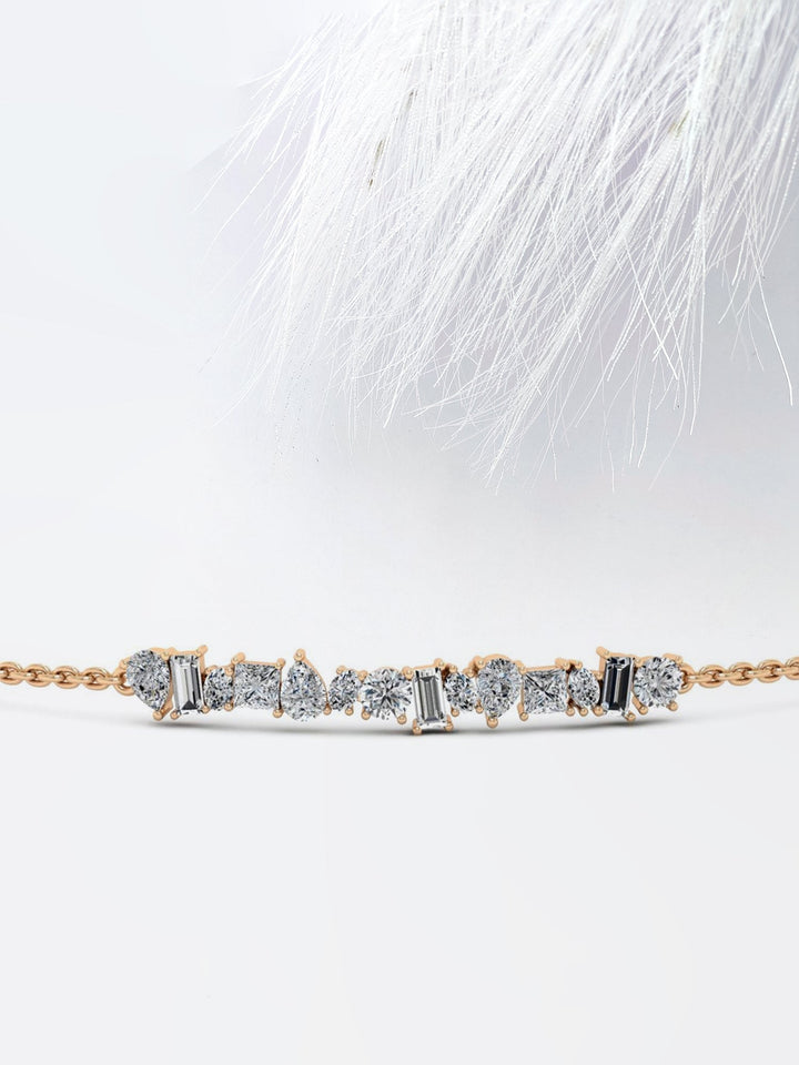 Adorn your wrist with a dazzling array of shapes with our Mix Shape Moissanite Diamond Cluster Bracelet in White Gold. This stunning bracelet features a cluster of various shapes, including round, oval, and cushion-cut moissanite diamonds, creating a mesmerizing and unique design. The diamonds are meticulously set in lustrous white gold, adding to the bracelet's brilliance and allure. Available in lengths ranging from 5 inches to 8 inches, this bracelet is designed to fit comfortably and securely, ensuring a perfect fit for every wrist. Whether worn alone as a statement piece or paired with other bracelets for a layered look, this Mix Shape Moissanite Diamond Cluster Bracelet is sure to elevate any outfit. Treat yourself or a loved one to the luxury and beauty of this exquisite diamond bracelet, perfect for any occasion.
