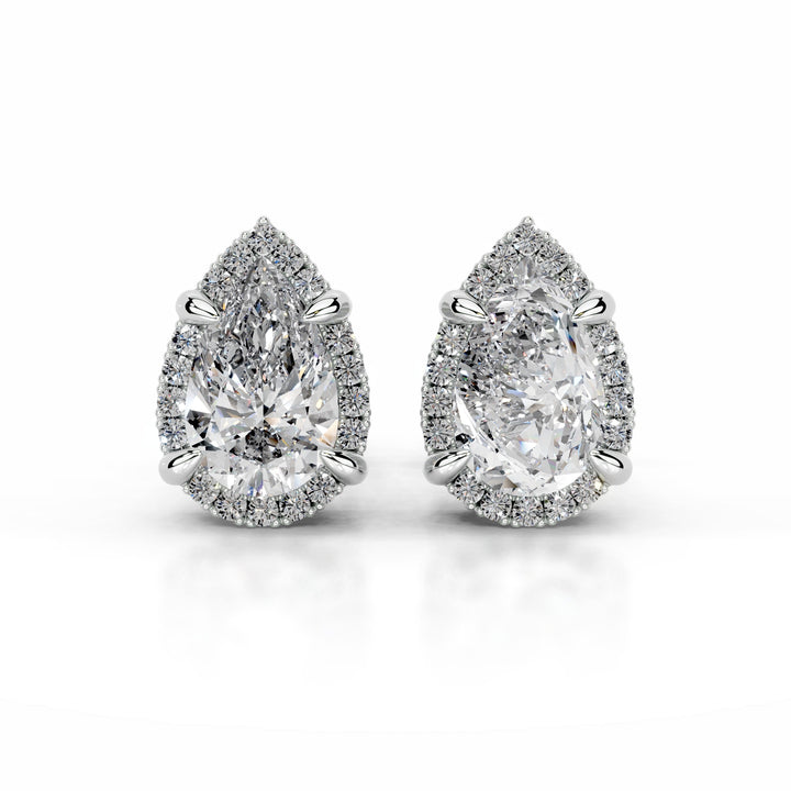Our exquisite Pear Stud Earrings adorned with a dazzling Round Brilliant Halo. the halo of round brilliant diamonds adds an enchanting sparkle, Perfect for adding a touch of glamour to any ensemble, these earrings are a testament to the enduring beauty.