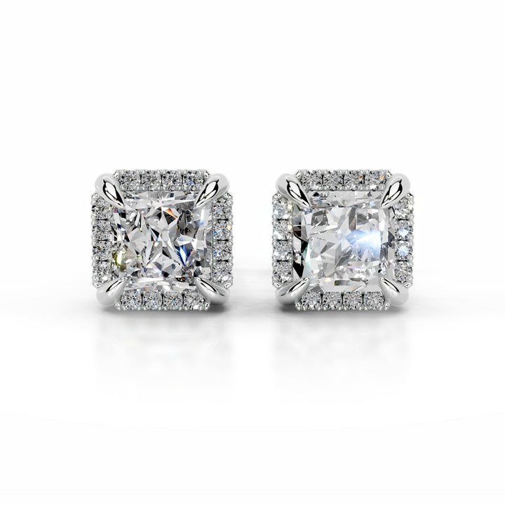 Our exquisite Princess Stud Earrings adorned with a dazzling Round Brilliant Halo. the halo of round brilliant diamonds adds an enchanting sparkle, Perfect for adding a touch of glamour to any ensemble, these earrings are a testament to the enduring beauty.