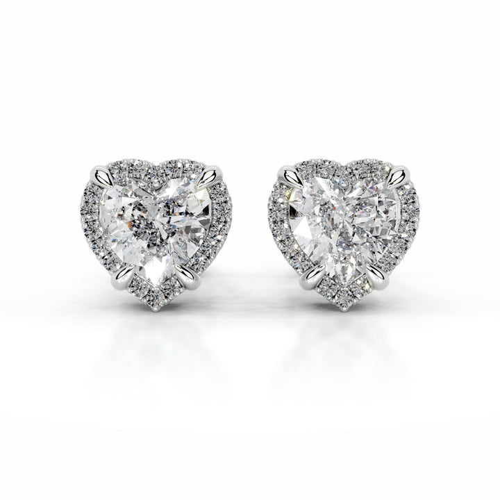 Our exquisite Heart Stud Earrings adorned with a dazzling Round Brilliant Halo. the halo of round brilliant diamonds adds an enchanting sparkle, Perfect for adding a touch of glamour to any ensemble, these earrings are a testament to the enduring beauty.